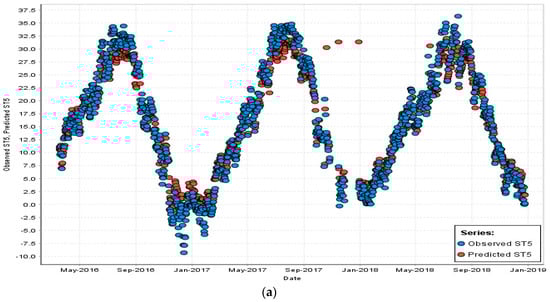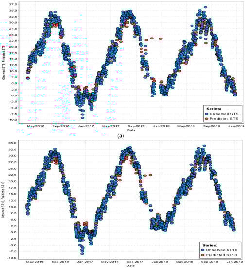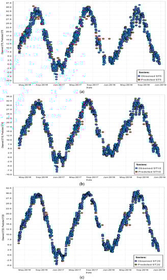 According to the results of the GBT model, the time series and scatter plots for all three depths are given in Figure 4. A very high level of agreement was achieved between the values predicted from the GBT model and the observed values at all depths except for a few days.