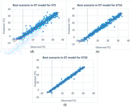 Comparison of observed and predicted: (a) soil temperatures at 5 cm depth; (b) soil temperatures at 10 cm depth; (c) soil temperatures at 20 cm depth; (d) best scenario for ST5; (e) best scenario for ST10 and (f) best scenario for ST20, 10, and 20 cm depth according to DT model.