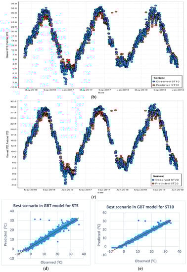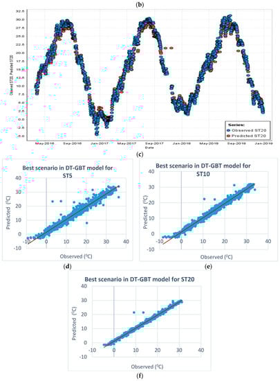 Comparison of observed and predicted: (a) soil temperatures at 5 cm depth; (b) soil temperatures at 10 cm depth; (c) soil temperatures at 20 cm depth; (d) best scenario for ST5; (e) best scenario for ST10 and (f) best scenario for ST20 Comparison of observed and predicted soil temperatures at 5, 10s and 20 cm depth according to the DT–GBT model.