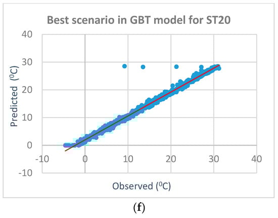 Comparison of observed and predicted: (a) soil temperatures at 5 cm depth; (b) soil temperatures at 10 cm depth; (c) soil temperatures at 20 cm depth; (d) best scenario for ST5; (e) best scenario for ST10 and (f) best scenario for ST20Comparison of observed and predicted soil temperatures at 5, 10, and 20 cm depth according to the GBT model.