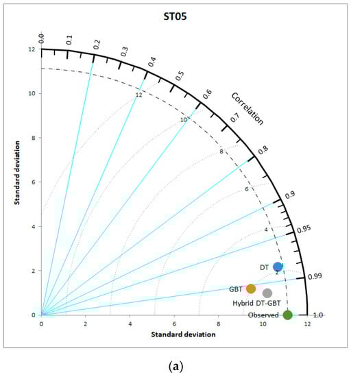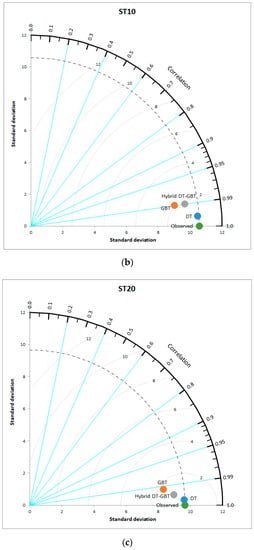 The performance of the models used for different depths is given visually as a Taylor diagram in Figure 6. As can be seen from Figure 6a, hybrid DT–GBT, GBT, and DT methods have best predicted soil temperature at 5 cm soil depth, respectively. As seen in Figure 6b,c, the best results in soil temperature estimation at 10 and 20 cm soil depths were obtained with DT, hybrid DT–GBT, and GBT methods, respectively.