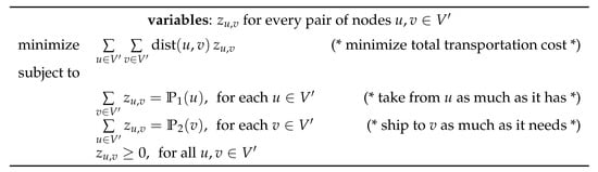 In this section, we provide the formal definition of the Ollivier–Ricci curvature. First, we need to define the so-called Earth Mover’s Distance (Emd) (also known as the transportation distance, the Wasserstein distance and the Monge-Kantorovich-Rubinstein distance) [24,25,26,27]. For the purpose of this paper, it suffices to define the distance in the discrete setting of a network as follows. Suppose that we have two probability distributions and on a subset of nodes, i.e., two real numbers for every node with . We can think of every number as the maximum total amount of “earth” (dirt) at node v that can be moved to other nodes, and every number as the maximum total amount of earth node v can store in its storage. The cost of transporting one unit of earth from node u to node v is , and the goal is to satisfy the storage requirement of all nodes by moving earths as needed while minimizing the total transportation cost. Letting the variable denote the amount of shipment from node u to node v in an optimal solution, Emd for the two probability distributions and on can be formulated as the linear programming () problem shown in Figure 1 which can be solved in polynomial time. One can also think of the Emd solution as the distance between two probability distributions and on the set of nodes based on the shortest-path metric on G. We will use the notation Emd to denote the value of the objective function in an optimal solution of the in Figure 1.
