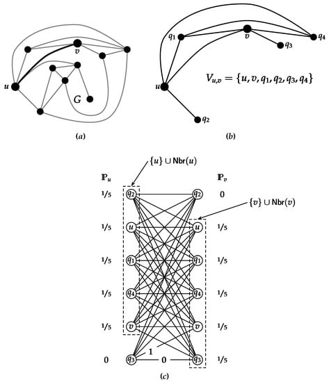 A pictorial illustration of calculation of . (a) The given graph G; (b) The subset of nodes ; (c) The distributions and . For visual clarity, only two distances and are shown.