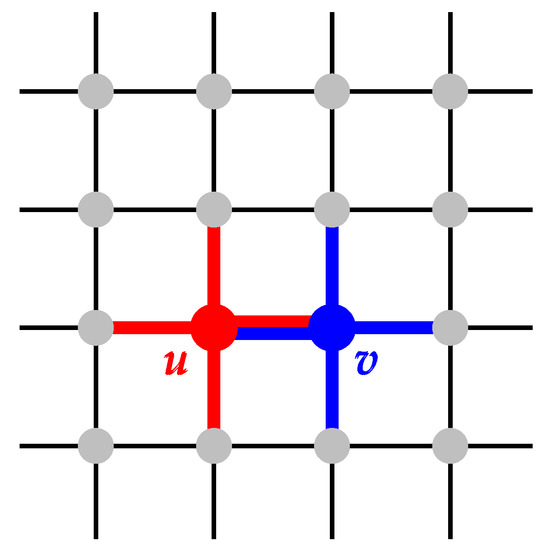 A pictorial illustration of calculation of for a two-dimensional grid. The blue edges, when shifted to the left by one unit, coincide with the red edges, giving Emd. It can also be argued that Emd (e.g., see [20] (Example 5) with ), thus giving Emd.