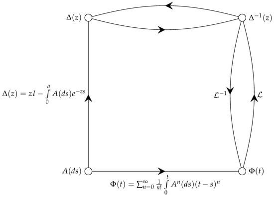 Figure 1 shows the relationship between the RFDE actors: the kernel matrix , the fundamental solution , the characteristic matrix , and the resolvent matrix . Note that Figure 1 shows two different routes to determine the fundamental solution from the kernel matrix : (i) the direct route from Equation (8), and (ii) the indirect route through the characteristic matrix, the resolvent matrix, and the Laplace inverse. Depending on circumstances, either route may be preferable.