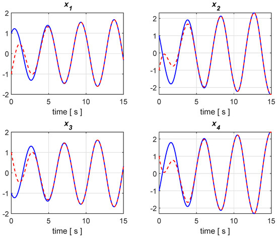 Figure 1 and Figure 2 illustrate the results of two simulations with the transient behavior of the state variables and their estimates, where the state variables are plotted in blue color with the corresponding estimates in dashed red. The first one in Figure 1 is a noise-free simulation, while truncated random Gaussian noises are considered in the second run of Figure 2, which exhibits a bounded estimation error, as foreseen because of the ISS property. Generally speaking, it is not difficult to construct examples of system and observer, for which ISS does not hold (see, e.g., [25,26]). From this point of view, the considered class of the Lipschitz nonlinear system is more easily tractable, owing to the linear structure, which allows to apply ISS and derive stability conditions that are given by LMIs.
