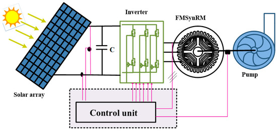 To combine the advantages of permanent magnet and reluctance motors, this paper proposes to use a ferrite magnet synchronous reluctance motor (FMSynRM) to enhance the efficiency, cost and reliability of the solar pumping system. FMSynRMs have received a remarkable attention from the researcher in the last few years [26,27,28,29,30]. This is thanks to their advantages such as about 75% of the delivered torque results from the rotor saliency. The remaining 25% of the torque comes from the ferrite magnets [28,30]. Besides, the ferrite magnets are available in the market with lower cost than rare-earth magnets. Further, the cost of ferrite magnet ranges from 7 USD/kg to 14 USD/kg, compared to 100$/kg for neodymium magnet as reported in [31]. Moreover, they can withstand higher temperatures before the demagnetization problem occurs. The proposed system will be used in pumping water during the day for irrigation or other human requirements, and therefore neither batteries nor DC-DC converter are necessary. A proposed control strategy to increase the output power from the PV system and to drive the motor at the maximum torque per ampere is done based on the motor inverter. To the best of the author’s knowledge, this work presents a novel solar pumping system that shows an improved energy extraction and usage as well as an increased reliability and efficiency. The proposed system is not reported before through the literature.