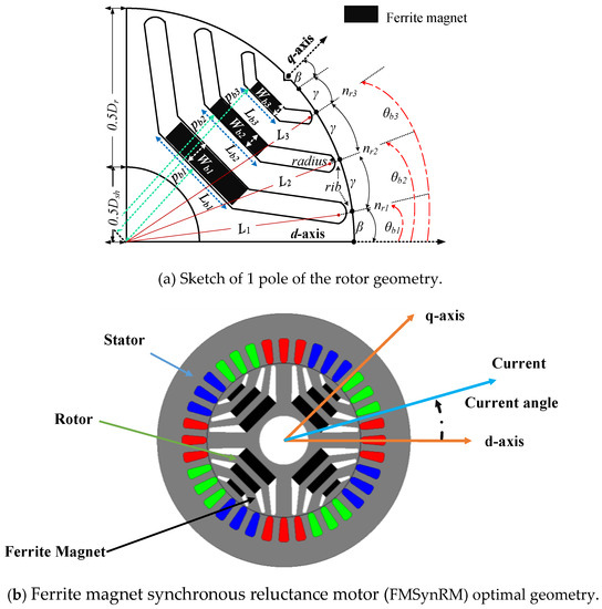 The finite element model (FEM) is constructed using Ansys Maxwell to obtain an optimal design for the motor. A four-pole rotor having three flux barriers per pole with inserted ferrite magnets in the center, see Figure 2, is considered. Three-phase distributed windings are used in the stator. The air gap length is 0.3 mm. The rated speed is 3000 rpm and the target power is 6.5 kW. An optimization technique using the gradient-free Nelder-Mead method is coupled with FEM to select the optimal rotor parameters that achieve the target motor power rating, keeping the torque ripple within the permissible range (<10%). Details of the complete design of FMSynRM is reported in [27]. A sketch of the optimal FMSynRM geometry is shown in Figure 2b.