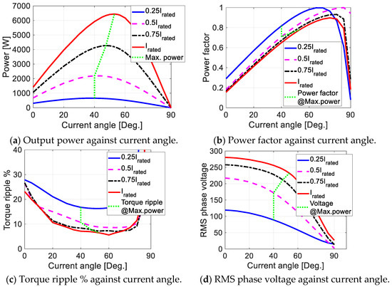 Figure 3 illustrates the performance of the designed FMSynRM at rated speed (3000 rpm). In this simulation, the motor inverter is emulated by a sinusoidal current supply. Figure 3a displays the change of the FMSynRM output power under different current angles for various winding currents (25–100% of the rated current). The current angle represents the angle between the d-axis and the winding current vector as sketched in Figure 2b. It is clear that the FMSynRM power varies with the current angle; there is a current angle at which the power of the motor is maximum, i.e., called optimal current angle. Further, the optimal current angle value is not a fixed value; it depends on the winding current level due to core saturation. This means that using a fixed current angle is not correct and it results in a reduction in the motor power. Consequently, using the optimal current angle during the control of the motor is important to maximize the motor output power. Moreover, the power of the motor at the rated current and optimal current angle reaches the target motor power for the application (i.e., about 6.5 kW). Figure 3b shows the motor power factor versus the current angle at various winding currents. One can see that the power factor of the designed FMSynRM reaches a unity power factor in contrast to the pure reluctance machines; this is thanks to adding the ferrite magnets. In addition, controlling the FMSynRM to work at the maximum power point reduces the power factor to about 0.8 and 0.78 at 25% and 100% of the rated stator winding current respectively. However, this power factor is still comparable to induction machines. Figure 3c shows the torque ripple variation of the FMSynRM versus the current angle at rated speed (3000 rpm). Notice that, the torque ripple is the difference between the maximum and minimum torque values divided by the average torque value at the given current angle. It is obvious that the torque ripple value is lower than the target value (10%) for winding currents from 50% to 100% of the rated value, which is the most important operating region for the desired application. However, it is slightly higher: up to 16.5% for lower currents. The selection of this optimal motor design is a trade-off between the required target power and torque ripple. Moreover, it is possible to further reduce the torque ripple by skewing the rotor. Figure 3d reports the RMS voltage of the phase winding. The voltage is around 230 V at rated current and optimal current angle.