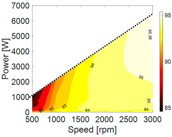FMSynRM efficiency map for speeds and winding currents up to the rated values.