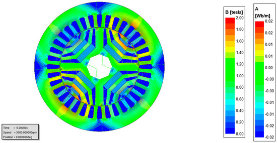 Figure 4 shows the FMSynRM efficiency map for various speeds and winding currents up to the rated values. It is obvious that the FMSynRM efficiency reaches more than 95%. Besides, the efficiency is about 90% at 30% of the rated power, which proves the wide range of higher efficiency operation of the FMSynRM. Without doubt, this will improve the energy consumption and size of the solar array and therefore, the whole system efficiency will be improved. Figure 5 reports the magnet flux distribution inside the FMSynRM. It is clear that the flux density values inside the tooth and yoke are within the permissible range, i.e., a maximum value of 1.7 T in the tooth based on the magnetization curve of the stator steel.