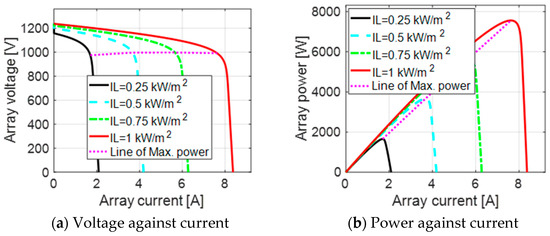 Based on the estimated motor and inverter ratings, it is possible to select the size of the solar array. A solar array of 7.5 kW is selected. The solar module specifications are listed in Table 2 and employed to form the solar array. To achieve the required DC bus voltage, 56 solar modules are connected in series to obtain the required solar array. The voltage and power versus the current of the solar array are reported in Figure 6.