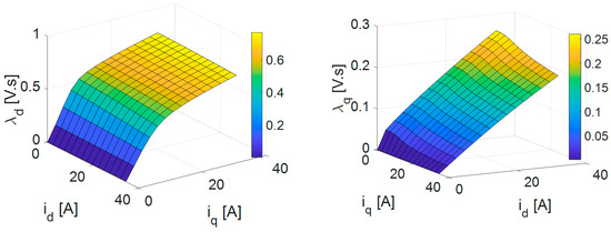 In synchronous reluctance machines, λd and λq vary nonlinearly with id and iq. Besides, the influence of both currents (id and iq) on the flux linkage in the other axis (λq and λd) is also evident. This means that accurate details about the variation of λd (id, iq) and λq (id, iq) are necessary. To do so, the FEM based on Ansys Maxwell, presented before, is used to generate λd (id, iq) and λq (id, iq) in lookup tables (LUTs), as reported in Figure 7.
