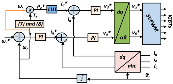 As mentioned before, the conventional voltage source inverter supplies the motor directly from the solar array. This inverter should be controlled in such a way to do two main tasks: (1) maximizing the output power from the solar array (the magenta dotted line in Figure 6b) and (2) driving the FMSynRM to work at the maximum power per ampere (the green dotted line in Figure 3a). To do those two tasks, the vector control strategy (VCS) is used to control the IGBTs switches of the inverter. The diagram of the VCS is reported in Figure 8. Three proportional-integral (PI) controllers are employed. The controller gains are set by trial and observation method. It is worth noting that only the reference speed signal (ωr*) is used to control the inverter. The speed reference signal (ωr*) controls the motor speed and thus the power flow of the system. Therefore, this signal has to be obtained from the maximum power point tracker (MPPT) of the solar array, see Figure 9.