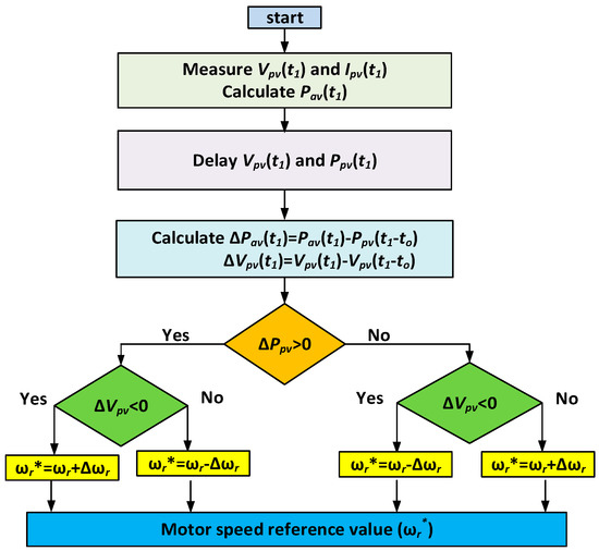 - Step 2: Using the perturbation and observation (P&O) tracking method illustrated in Figure 9, the reference speed is increased until the maximum available power of the solar array is reached. At the MPP, there is always an increase and a decrease in the reference speed (ωr*) by Δωr*;