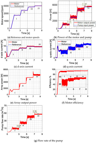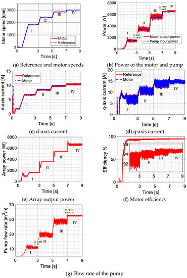 Figure 10 reports the performance of the proposed system. Figure 10a shows the reference and motor speeds at various irradiation levels. It is obvious that the motor speed follows accurately the reference value at all irradiation levels. The motor output power and the pump input power are plotted in Figure 10b. At rated speed (i.e., IV region), the motor output power is similar to the maximum power point at the rated conditions in Figure 3, which proves that the motor is successfully working at the desired point (i.e., maximum power per ampere). This is also evident in Figure 10c,d in which the d and q-axis current components are shown. The d-axis current varies based on the required power to achieve the maximum power per ampere condition and the q-axis current varies to achieve the required power. In addition, here the d and q-axis current components of the motor follow accurately the reference values. Figure 10a,c and d prove that the PI controllers are working properly. Figure 10e shows the solar array output power at the different irradiation levels. Comparing Figure 10e with the solar array characteristics shown in Figure 6, it is evident that the maximum available power of the solar array is successfully extracted. Notice that Figure 6 shows the solar array characteristics at the ambient temperature of 25° C, while Figure 9 considers a practical condition of ambient temperature i.e., 30°. Figure 10f shows the motor efficiency. Interestingly enough, a wide range of high efficiency is evident. The efficiency is more than 92% for low irradiation levels i.e., 0.25 kW/m2 and around 95% for high irradiation levels i.e., 1 kW/m2. This means that the whole system efficiency will be enhanced. Finally, Figure 10g shows the flow rate of the pump.