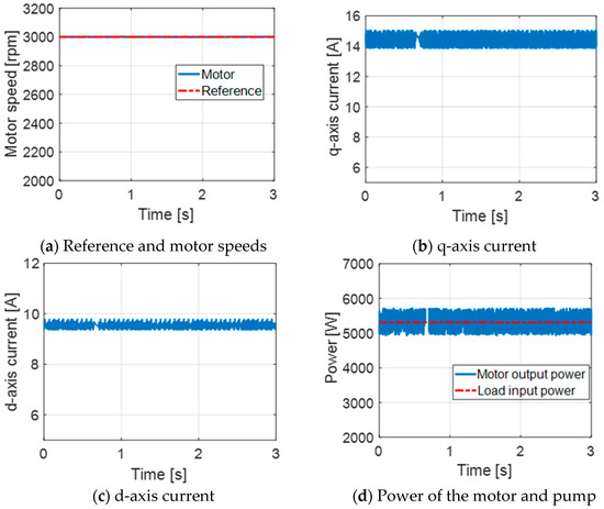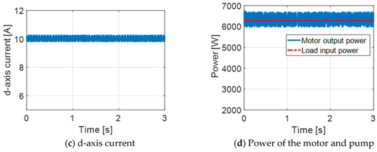 Figure 13 reports the measured performance of the FMSynRM at rated condition, and validates the simulation results presented in Figure 10 (region IV). A real solar array and pump are not present in the laboratory due to the size and the cost. Instead, a controlled DC supply is used to emulate the solar array characteristics while the induction motor is employed to emulate the centrifugal pump characteristics. The controlled DC supply is used to emulate the solar array characteristics while the induction motor is employed to emulate the centrifugal pump characteristics. The reference speed, which is the output of the MPPT in Figure 9, is given to the control system. It is clear from Figure 13a that the motor speed follows accurately the reference value. The d-and q-axis current components of the motor are shown in Figure 13b,c. The measured motor and load power are shown in Figure 13d. Comparing the measured results of Figure 13 with those obtained by simulation of Figure 10 (region IV), it evident that there is a good correspondence between the theoretical and experimental results.