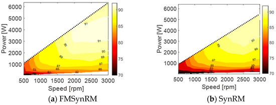 Figure 16 reports the measured efficiency maps of the whole drive system (inverter + motor) of FMSynRM and SynRM at various loading conditions up to the rated value. It is obvious that FMSynRM has a higher efficiency with a wide range compared to SynRM. This corresponds well with those expected by the simulations. However, there is some difference between the measured and simulated efficiencies (about 2% in the motor efficiency) due to mainly neglecting the mechanical and inverter losses in the simulation.