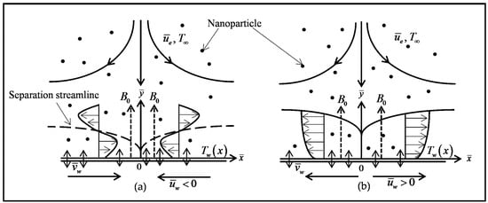 Contemplate an incompressible two-dimensional stagnation-point flow of a Sutterby nanofluid across a stretching/shrinking sheet as shown in Figure 1, where x and y are the Cartesian coordinates with the x-axis positioned in the horizontal direction, and the y-coordinate is normal to the x-coordinate. The free stream velocity is denoted by and signifies the velocity of the moving sheet, where infers the state of the stretching sheet, the embodies shrinking sheet, and typifies the stationary sheet. The moving (stretching or shrinking) sheet is penetrable and there is a uniform surface mass flux, of velocity with to imply the injection situation and for the suction state. The free stream temperature and the wall temperature are denoted by and respectively.