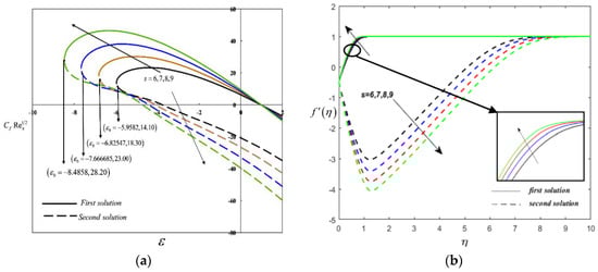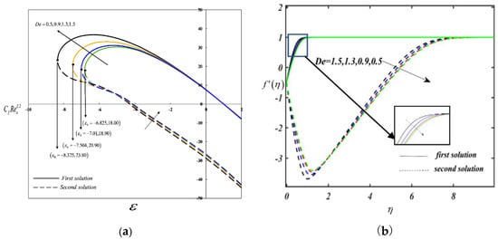 Figure 3 demonstrates the impact of the Deborah number (De) on and velocity profiles. Both solutions in Figure 3a convey that an increment in De augments the values of as the sheet is shrinking. The Deborah number is used to enlighten the viscoelastic feature of a material. Here, an increment in De results in the increment of the shear thickening Sutterby fluid velocity. The valuable work of Azhar et al. [34] also reported a similar trend. The increment of the fluid velocity then enhances the wall shear stress past the shrinking sheet and increases the values of The increment in s and De assist in delaying the flow separation significantly.