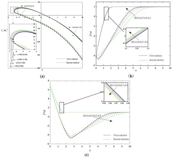 Impact of the magnetic parameter (M) on: (a) the reduced skin friction coefficient; (b) velocity profiles as M varies past a shrinking sheet ; (c) velocity profiles as M varies past a stretching sheet when , and .