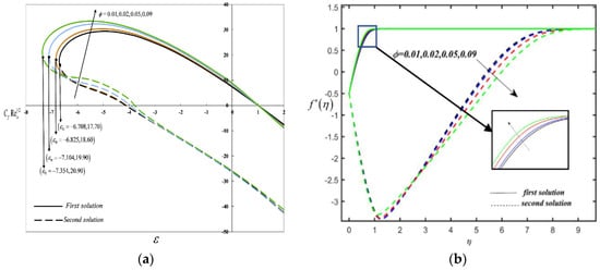 Figure 5 portrays the effect of the nanoparticle volume fraction or on and velocity profiles. The increment in increases the values of over a permeable shrinking sheet. An increased ratio of in the base fluid increases fluid viscosity, which then enhances the fluid velocity past the permeable shrinking sheet (see Figure 5b). These then affect the wall shear stress to increase and, consequently, raise the values of Velocity overshoots in the boundary layer are apparent in Figure 2b, Figure 3b, Figure 4b and Figure 5b. These velocity overshoots near the permeable shrinking sheet indicate that the fluid velocity is higher than the shrinking sheet’s velocity [42].