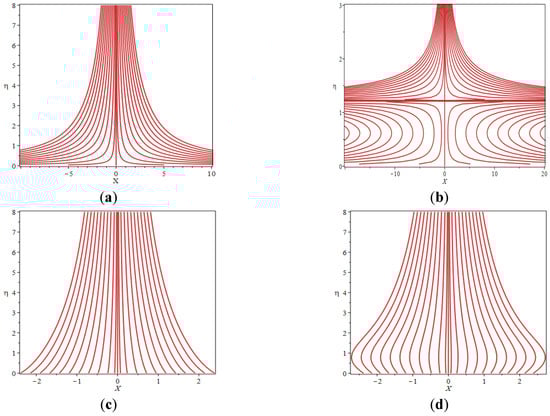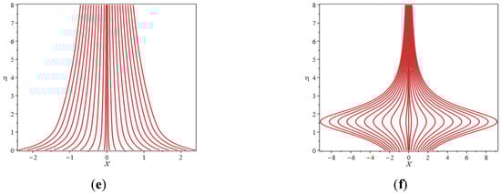 Figure 6 depicts the streamlines of the Sutterby fluid under a number of settings. In particular, Figure 6a shows the streamlines when the sheet is impermeable and stretching at the rate of 1.4, while Figure 6b illustrates the streamlines when the sheet is impermeable and shrinking. The reverse flow in Figure 6b is noticeable and proves that the shrinking sheet’s state instigates the reverse flow. Next, the streamlines for the fluid flow under the suction influence can be examined (see Figure 6c,d). The reverse flow is now absent past the permeable shrinking sheet (Figure 6d). Thus, it is proved that mass suction succeeds in sustaining the laminar boundary layer flow over a shrinking surface. Figure 6e,f shows the behavior of fluid flow when the rate of stretching or shrinking increases; the fluid pattern being pulled at the surface of the sheet is clear, and again the reverse flow is absent.