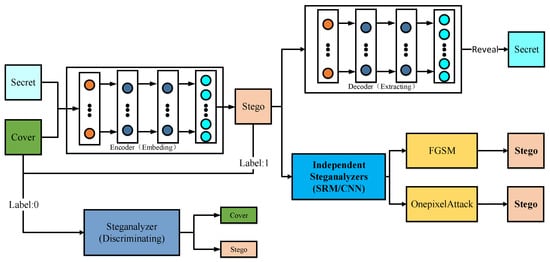 In this work, there are three modules in our method: The encoder, the decoder and the steganalyzer. The task of the encoder module is to produce the stego image. The task of steganalyzer is to detect the stego image whether they contain a secret message. The task of the decoder module is to extract the secret message in the stego image. Therefore, we use two deep learning networks to conceal and reveal a secret message. The goal of the model to conceal the secret image within the cover. Thus, the task of the training is discriminative in the model training. First, the encoder module takes in cover images and secret message and outputs stego image. Then, the steganalyzer tries to detect the secret message in the image, resulting in the ability to determine whether the stego contains message.