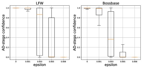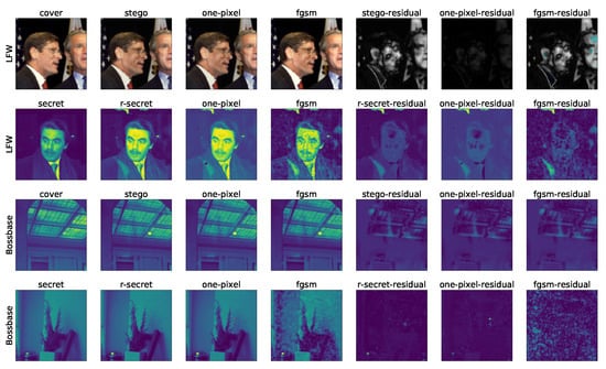 We use PyTorch [30] frame to build our model. The input cover and secret images were randomly selected in the training set. We balance between the steganalyzer and decoder losses by using = 0.5, = 1, = 1 on LFW data set. = 0.8, = 1, = 1 for Bossbase data set. We use Adam method to train our model for 150 epochs. The learning rate is set to 0.0001. We selected 1000 attack test samples in every security enhancement Experiments. In FGSM, we use four different to control the changes to original stegos. In Onepixelattack, we use four different p to control the success rate of the attack, the seed is set to 500, and the maximum number of iterations is set to 50.