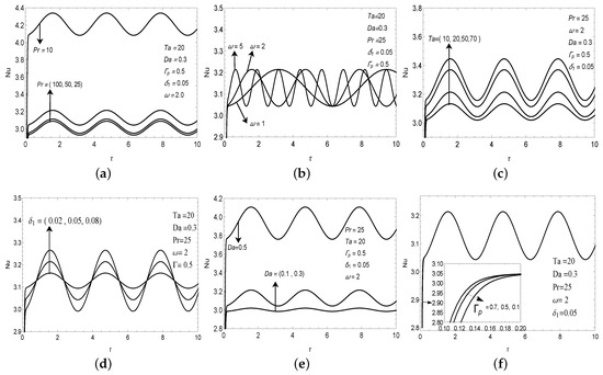 In this section, we have discussed the graphical representation of numerical outcomes in terms of heat transport versus slow time under rotational speed modulation of Walter-B viscoelastic fluid in highly permeable porous media. The study is performed under the weakly nonlinear stability theory, which indicates that the stability is possible by a certain choice of physical parameters. As we have known that many real-life applications complying with thermal convection under external regulatory forces are used for enhancing or inhibiting the heat transport in engineering and science, industry, food process, turbo-machinery, and chemical industry. Consequently, the rotational speed modulation as an external regulatory mechanism has been considered for the study of Walter-B viscoelastic fluid. The non-dimensional parameters that arise in the problem are , , , , , , and . These parameters influence the convective heat transfer. For the range of the considered parameters, we have followed the articles of Shivkumara et al. [41], Beg and Makinde [6], and Kumar et al. [30]. Furthermore, as the Darcy number increases, the flow profile decreases due to the Darcian force decrease (Beg and Makinde [6]). Thus, a higher Darcy number has been considered to accelerate the flow formation. The common values of the parameters are taken as = 25, = 0.3, = 2, = 0.05, = 0.5, and = 20 (unless otherwise stated). In all figures, the Nusselt number ()) concerning slow time under rotational speed modulation has been plotted for Walter-B viscoelastic fluid from Figure 2a–f.