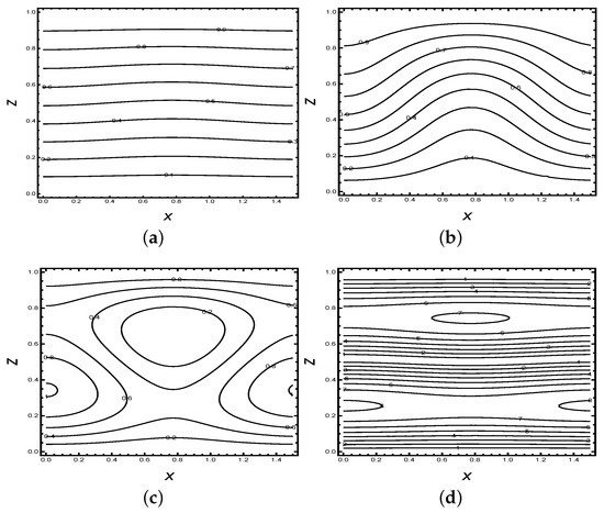 Streamlines for the fixed values of parameters at different scaled time (a) , (b) , (c) , (d) for the fixed values of = 25, = 0.3, = 2, = 0.05, = 0.5 and = 20.