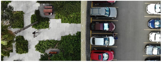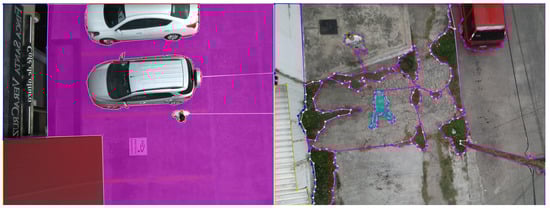 The dataset used contains photos that were taken from lower heights with drones or with cellphones from places, such as roofs or bridges similar to the Inria Aerial Dataset [59], but from a height where is easy to detect a mobile robot. It consists of 2647 images, where 2203 were taken for the training. The images do not have a fixed resolution or shape. They were labeled by an expert in the software labelme [60], see Figure 8. The quantity of images in which each class is present is shown in Table 1 except for the class background that is not labeled. The dataset was augmented with the transformations presented in Table 2. The dataset is available to the reader and the information can be consulted in the Supplementary Material section.