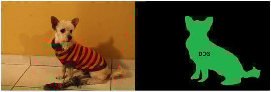 Given the amount of data provided by a visual sensor mounted on a UAV, we require a preprocessing algorithm that extracts the most important information. To solve this problem, we propose an approach that is based on image segmentation. In image segmentation, the image is divided into different entities similar to Figure 2 where a dog is segmented from the image, and the rest is considered background. In our approach, a two-dimensional (2D) map is generated from aerial images using semantic segmentation with a Convolutional Neural Network (CNN). To perform this task, we assign a cost to each pixel in the image according to a classification over twelve classes. Our CNN has a U-shaped architecture that is based on U-net described in [7], which acts as an encoder-decoder, this architecture has shown great performance with limited data sets [8,9,10]. This semantic segmented image can be used to improve a map, since we have a pixel-level segmentation that can generate a more detailed map for a mobile robot navigation task.
