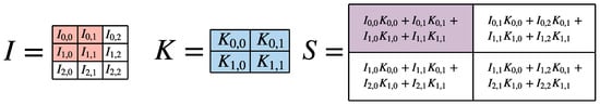 where S is the map of features, I is the input image, K is the kernel or filter, and are the indexes for rows and columns inside the kernel. Figure 3 shows a graphic description of how the output is generated.