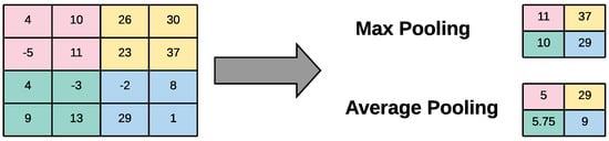 One advantage of CNNs in image processing is that they share weights. Weight sharing reduces the parameters to learn; therefore, the required memory is lower. Subsequently, the convolutional layer applies the convolution of the kernel over the image or the output of another convolutional layer to produce a linear output that will be passed through a no lineal activation function, such as Sigmoid, Hyperbolic Tangent, Rectified Linear Unit (ReLU), Exponential Linear Unit (ELU), or Leaky ReLU. Other types of layers are the pooling layers that can be Max or Average, where the purpose is to reduce the number of parameters and controlling the overfitting, reducing the size of the network by taking the maximum or the average value of the area where the kernel is passing over the input. A graphic representation is shown in Figure 4, where max and average pooling layers of size 2 × 2 are passed to an array of 4 × 4.