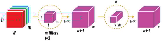 Depthwise Separable Convolutional divides the standard convolution into a depthwise convolution and an 1 × 1 convolution named pointwise. The first division takes an input of and applies m filters of size 1, where f is the height and width of the filter and m is equal to the number of channels in the input, as a result, an intermediate output of is generated. The pointwise part uses n filters of size to generate an output of , as shown in Figure 6.