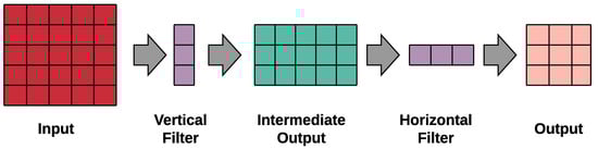 This convolution separates the kernel of in two: one vertical and one horizontal, since they normally have dimensions of and , respectively. This division of the filter reduces the number of multiplications. For example, if , instead of having nine multiplications in the conventional convolution, with the separation there are six multiplications, three for the vertical and three for the horizontal, Figure 7 shows a graphic description of the separation and how the output has the same dimension as if a filter of were applied to one channel image.