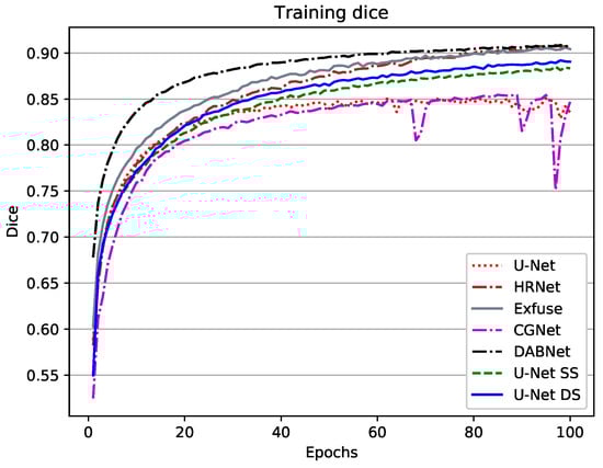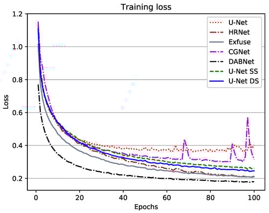 Our approach is compared against the typical U-Net, two networks that are focused on real-time semantic segmentation: the Light-weight Context Guided Network (CGNet) [61], DABNet [62], Additionally, a light version of the high-resolution network (HRNet) [63] with the number of kernels in each block reduced by a half. Finally, against Exfuse [64] with ResNet18 as the backbone encoder. Figure 9 and Figure 10 present the comparative of the training.