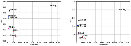 Comparison of the Dice and IoU scores vs. number of parameters.