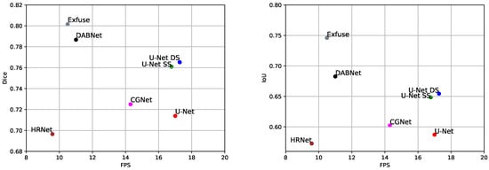 are presented in Table 3. It is shown that, as it occurred in the training, the ones that outperformed our approach were Exfuse and DABNet. Exfuse surpassed ours by 0.0363 in Dice 0.0915 in IOU, DABNet got a higher score with a difference of 0.0225 in Dice and 0.0282 in the IoU with respect to the U-Net with DS, but DABNet has an increase in the number of parameters of 96% and Exfuse 3997%. Concerning the frames per second (FPS) the one with the best results was U-Net DS with 17.2725 FPS against DABNet with 11.0042 FPS, which represents that our proposed architecture is 56.96% faster than DABNet and 64.48%. On the side of the other architectures, these were outperformed in all four aspects, called Dice, IOU, parameters, and FPS. These results are easily visible in Figure 11 and Figure 12.