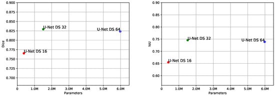 Comparison of the U-Net DS changing values of C to 16, 32 and 64 in Dice and IoU scores vs. number of parameters.
