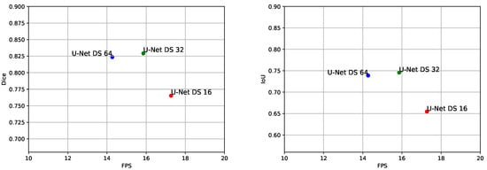 Comparison of the U-Net DS changing values of C to 16, 32 and 64 in Dice and IoU scores vs. FPS.
