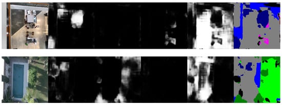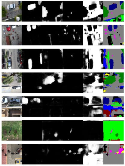 Additionally, Table 4 presents the results for each class using the U-net with depthwise separable convolutions, which gives a major understanding of the general results. The low score in the injured person class is due to the dataset lacks a considerable amount of examples with injured persons whereas classes, like tile, cement, and grass, have a similar texture or color, or the car class where the majority of the cars have a similar shape just changing the color are easy to learn for the net. Additionally, most of the higher scores match with the number of examples per class, as an example, the class cement is present in 2117 images from 2203 from the training dataset, while classes with low scores, such as Injured Person and Stairs are present in 10 and 91 images, respectively. Qualitative results are shown in Figure 15 with the input, the output of four of the twelve classes, and finally, the map with all of the classes colored. The simplicity of the implementation, the low inference time, and the low hardware requirements such as memory, processor or graphic card are some of the many advantages of the proposal achieved thanks to the architecture and the choice of a reduced number of filters combined with the use of depthwise convolution.