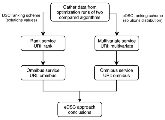 The DSCTool implementation is based on the Deep Statistical Comparison (DSC) approach [15] and its variants. Because of that it provides robust statistical analysis, since comparisons are based on data distribution, which reduces the influence of outliers and small differences in the data. In this research, we only used web services that implement DSC and eDSC ranking scheme used for establishing exploration and exploitation abilities for single-objective optimization algorithms.