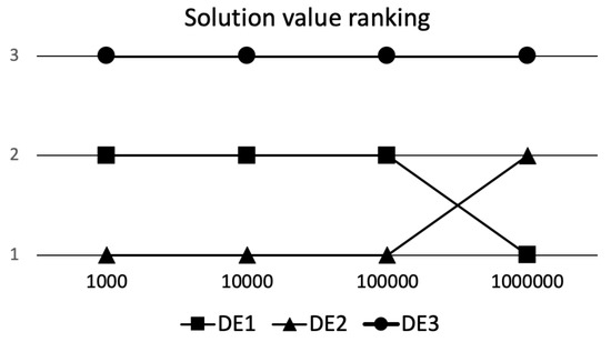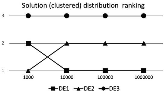 If we have at our disposal more FEs, then having more clustered distribution of solutions early in the optimization process does not necessary guaranty high quality of solutions later on. If all runs quickly converge to the same area in solution space, one could see this as too quick convergence. In such cases when multimodal search space is explored, the algorithm might be trapped in some local optima. So quick convergence at the beginning of the optimization process is not guaranty of high quality algorithm or its hyperparameters in the long run. Let us look at the Table 3, where results for comparing the algorithm performances achieved on D*10,000 FEs are presented. The DE3 algorithm stayed as the worst performing algorithm, but the relation between the quality of DE1 and DE2 has significantly changed. As we can observe, the preferred distribution of solutions is now significantly better for DE1 algorithm. So seemingly worst initial exploration abilities of DE1 algorithm paid dividends that allowed for achieving significantly better preferred solution distribution. The question that arises is, did we choose the correct preferred distribution when evaluating algorithms at D*1000 FEs? If target FEs would be D*1000 then the selection was correct; however, looking at the results obtained at D*10,000 FEs the answer is not so clear.