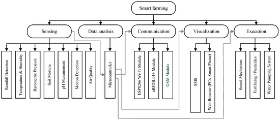 An intelligent automation system for an agricultural enterprise based on the IoT consists of five interconnected subsystems: sensing [24], data analysis [25], communication [26], visualization [27], and execution. The sensing subsystem is interconnected with the data analysis subsystem, where the raw data from each sensor is processed and analyzed individually with various algorithms implemented in the microcontroller for the visualization and execution subsystem [28]. The process of visualizing the sensor data directly depends on the communication subsystem, since access to these data via a mobile phone, smartphone, or PC requires establishing a connection to the modules of the communication subsystem. If the user (farm worker) wants to visualize the data through a web browser, then the IoT ESP8266 module is required [29]. If one wants to receive a short message on a mobile phone, the data will be visualized through the Arduino “Sketch” IDE serial monitor, and will depend on the nRF24L01 module [30] and so on. The system is capable of making decisions and executing them based on the sensor data used by the execution subsystem, which are the main subject of the presented system. Figure 2 shows the structure of an intelligent automation system for an agricultural enterprise.
