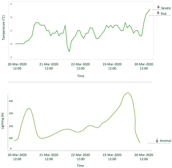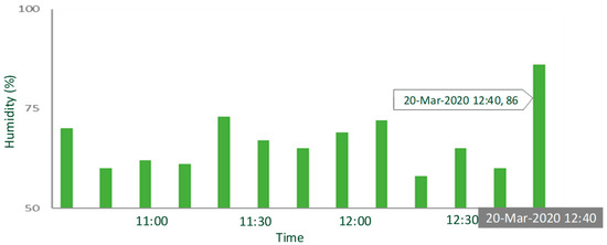 Figure 3 and Figure 4 present examples of program performance. Figure 3 demonstrates the results of monitoring humidity in the room where crops are grown. At 12:40, the permissible humidity level was exceeded and the microcontroller initiated a command to stop the water supply to the sprayer. Figure 4 shows the report on illumination and temperature levels’ change to ensure effective plant growing. It can be seen that, when the set values are exceeded, the users are notified and the indicators are adjusted using the necessary equipment (setting the intensity of main and supplemental lighting, fan speed, etc.).