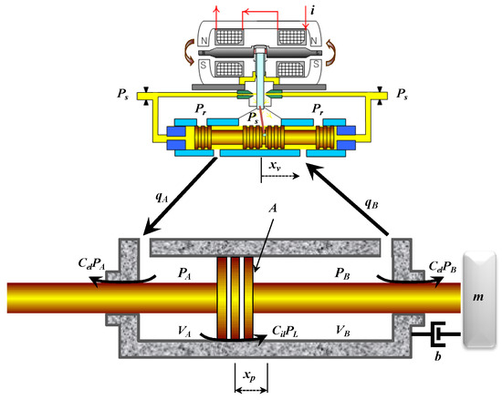 where is the spool position of the servo-valve [m], i is the input current of the torque motor [mA], and is the torque motor gain [m/mA]. The cylinder chambers are connected to the servo valve through cylinder ports, and the flow rate of hydraulic fluid in the chambers is controlled by the servo valve. The actuator force is generated by the load pressure which is the difference between the pressures at two ports: A and B. The control flow equation of the hydraulic valve for the load flow rate can be expressed [1] as