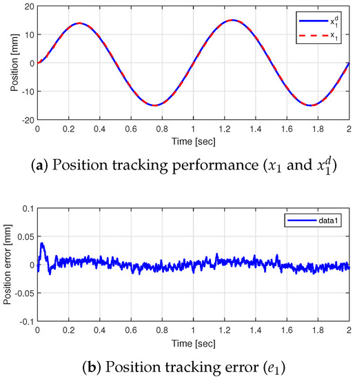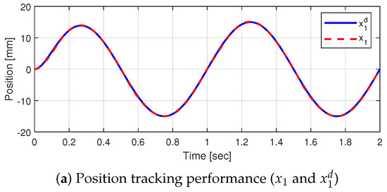 Figure 4 shows the simulation results for case 1. Because , the convergence rate of the load torque observer (18) depends only on . At the beginning, because was near zero, the convergence rate of the estimation was low. However, the estimated magnitude converged to the actual magnitude as soon as moved away from zero. The position tracking error was relatively large at the beginning due to the failure of load torque estimation. After 0.1 s, because the load torque was compensated, tracked well as shown in Figure 4a,b.