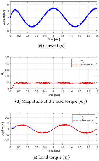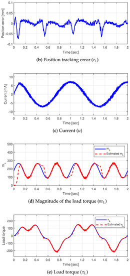 In Case 2, the estimation performance for the time-varying magnitude of the load torque, i.e., was tested. Figure 5 shows the simulation results of case 2 are shown. Estimation of the load torque magnitude failed because was near zero at the outset, as shown in Figure 5d. However, the estimated magnitude of the load torque converged to the actual magnitude again once was far from zero. Because the desired position is a sinusoidal signal, this situation occurred repeatedly. Although estimation of load torque magnitude failed near , its estimation error was relatively small since is minute near . Therefore, the failure to estimate the load torque magnitude did not significantly affect position tracking performance.
